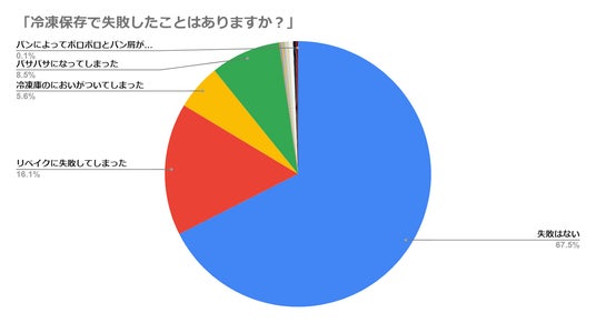 3割強の人が「冷凍保存に失敗した」と答えています。解凍して焼き直す、リベイクの際に失敗してしまったり、冷凍後のにおいがついてしまった、冷凍の仕方がうまくいかずパサパサになってしまったなどの声が挙がりました。