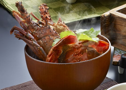 漁港直送の伊勢海老はホテルの生け簀で活かし、提供直前に熟練の料理人が捌きます。伊勢海老の「ギーギー」という鳴き声や足や触覚はまだ動いているのを見ても新鮮さが伝わってきます。活き造りのあとの頭などの殻は、一旦お下げして味噌汁に。伊勢海老から出る濃厚な旨味を余すところなく楽しんでいただけます。