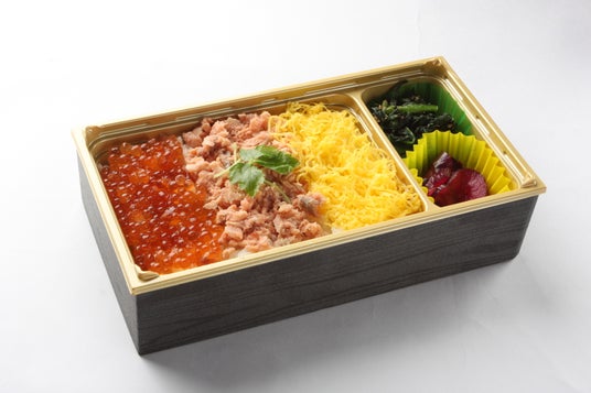 鮭の荒ほぐし、いくら、錦糸玉子をたっぷりのせた色鮮やかな三色お重。鮭・いくらの旨味と錦糸玉子の優しい甘さのハーモニーをお楽しみいただけます。