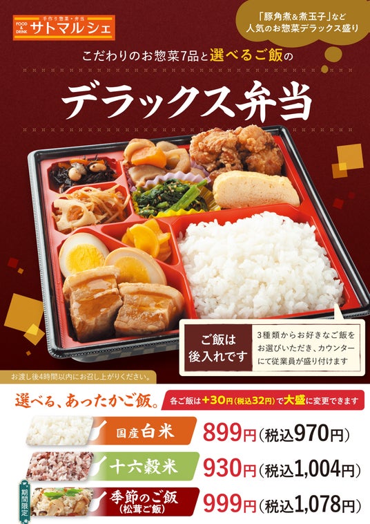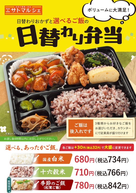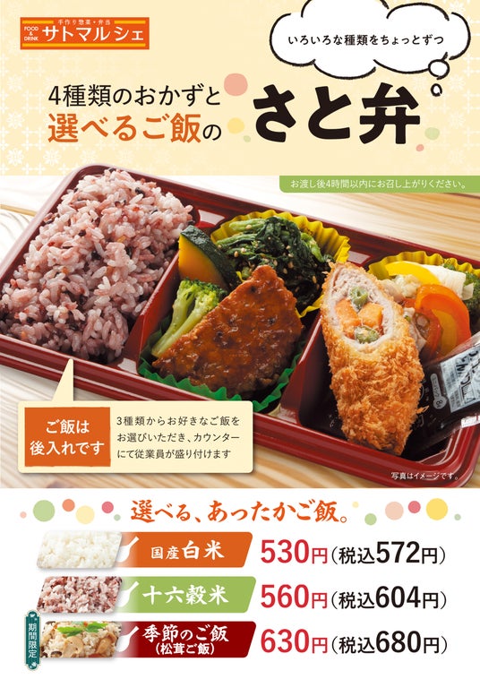 「サトマルシェ」「厨房さと」では旬の食材を盛り込んだ「季節の味覚弁当」に加え、「季節のごはん」で旬の味覚を手軽に楽しめる『選べるご飯のお弁当』を販売しております。