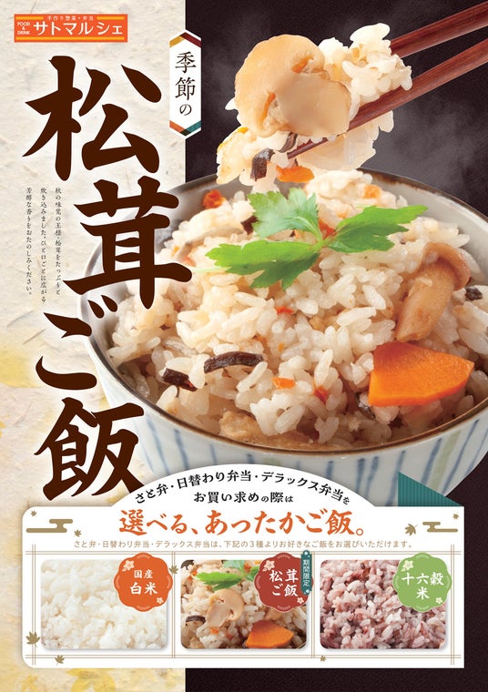 8/27(火)~11月上旬までの期間限定で、季節のごはんとして「松茸ご飯」が登場します。香り豊かな松茸をごぼう・人参・お揚げなどと共に炊き込んだ、秋限定の炊き込みごはんです。100g当たり税込216円で単品販売する他、「さと弁」「日替わり弁当」「デラックス弁当」のごはんとしてもお選びいただけます。