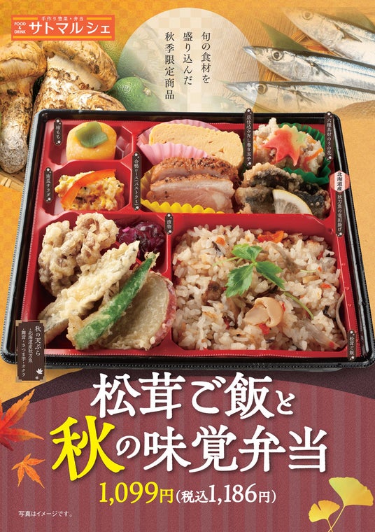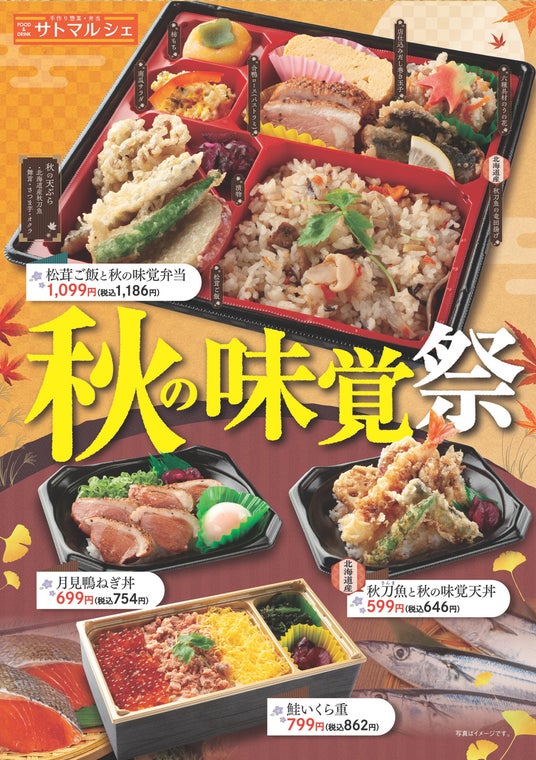 「松茸の炊き込みご飯」や「北海道産秋刀魚の竜田揚げ」、「合鴨ロース」、「南瓜サラダ」、「秋の天ぷら盛り合わせ」などの旬の味覚を贅沢に盛り込んだ期間限定商品です。
