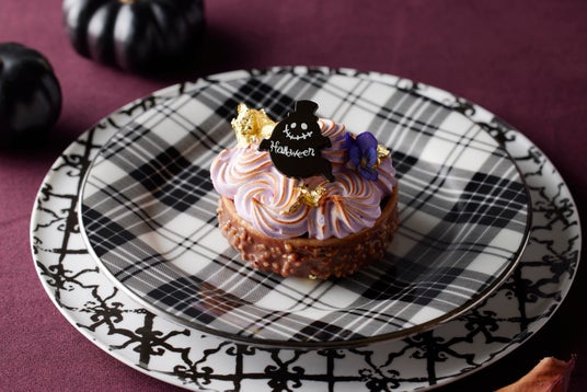 カリっとした食感が楽しいアマンドチョコレートを合わせたシュクレ生地にバニラムースを流し込み、ルバーブといちごのジャムの甘酸っぱさでアクセントを付けました。トップにはカシスメレンゲを絞り、ゴーストを模ったチョコレートを乗せ、ハロウィンらしい見た目に仕上げました。