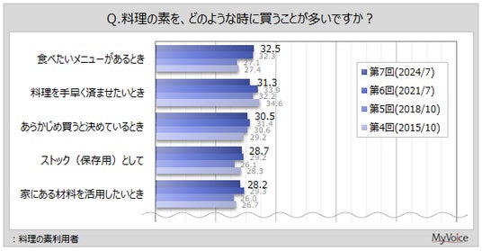 ■料理の素を購入する場面は、「食べたいメニューがあるとき」「料理を手早く済ませたいとき」「あらかじめ買うと決めているとき」が利用者の各3割強。利用頻度が高い層では「あらかじめ買うと決めているとき」「家にある材料を活用したいとき」が上位2位
