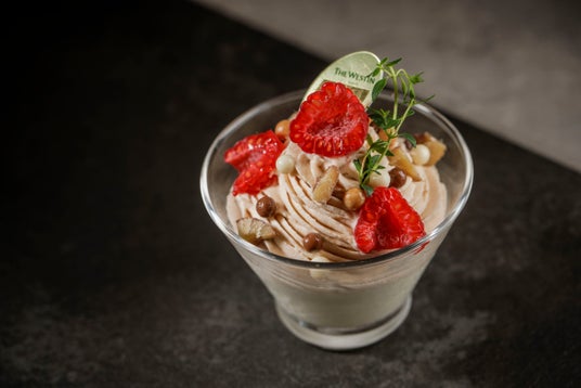 マロンのブランマンジェ モンブランスタイル ¥1,100ラム酒が香り豊かなブランマンジェの上に、軽い口当たりのマロンシャンティを絞ったモンブラン仕立てのグラススイーツです。フレッシュなラズベリーの甘酸っぱさをアクセントに添えて、爽やかに仕上げました。優しい秋の味わいをお楽しみいただくスイーツです。