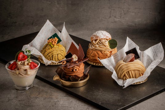 写真左から:マロンのブランマンジェ モンブランスタイル、モンブラン ピスタチオ、ヘーゼルナッツとチョコレートのモンブラン、モンブランシュークリーム、スペシャルモンブラン