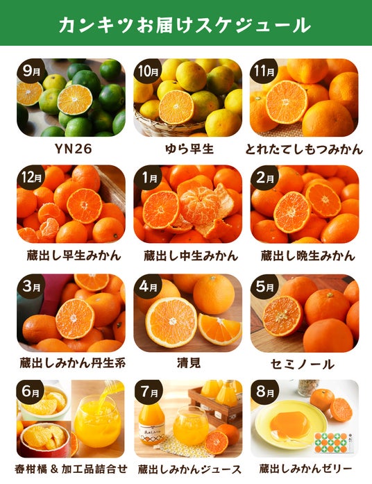 9月~3月まで、極早生から晩生までの温州みかん、4月~6月は春カンキツ、6~8月は蔵出しみかんの加工品が楽しめます!長い期間生のみかんが楽しめるのは貯蔵産地ならではです♪