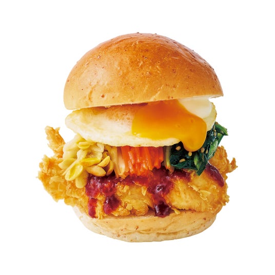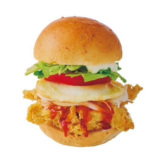 韓国チキンの定番であるヤンニョムソースを使用した月見バーガーをご用意しました。「オリーブチキンカフェ」オリジナルの甘辛いヤンニョムソースは、コチュジャンの他に隠し味としてブルーチーズや梅干しなどを入れてオリエンタルなコクがたっぷり。とろ~り黄身の目玉焼き風オムレツとともにチキンに絡んで韓国チキンファンにはたまらないの月見バーガーとなりました。