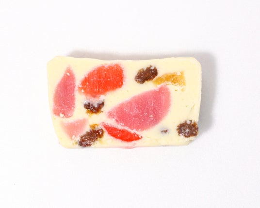 蜜りんごとぶどうのグミ、ドライフルーツを混ぜ込んだ洋梨チョコレートです。口に入れた瞬間、果実の香りがふわっと広がり、秋の優しい甘みを感じられます。チョコレートとグミとドライフルーツの3つの食感をお楽しみください。