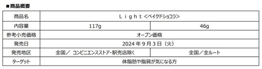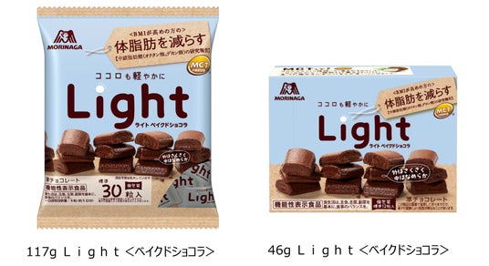 「Light<ベイクドショコラ>」は、製品中MCTオイルを10%使用しており、チョコの甘さや香りでココロも軽やかに気持ちを明るく照らすベイクドチョコレートです。本品には中鎖脂肪酸(オクタン酸、デカン酸)が含まれます。中鎖脂肪酸(オクタン酸、デカン酸)はBMIが高めの方のウエスト周囲径の減少、体脂肪や内臓脂肪を減らすことが報告されています。MCTオイルを使用した外側サクサク、内側なめらか食感のベイクドチョコレート「Light<ベイクドショコラ>」の発売で、お客様のウェルネスライフをサポートしてまいります。