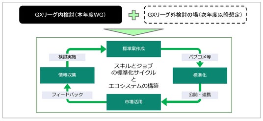 GX人材に関する内外労働市場の垂直立ち上げに向けた検討を目的とし、スキルアップNeXtが立ち上げ、その主旨に賛同する企業とともに2023年度より活動するWGです。その成果物として、GXスキル標準(GXSS)を策定し今年5月に公表しました。本年度は主に下記について取り組みます。