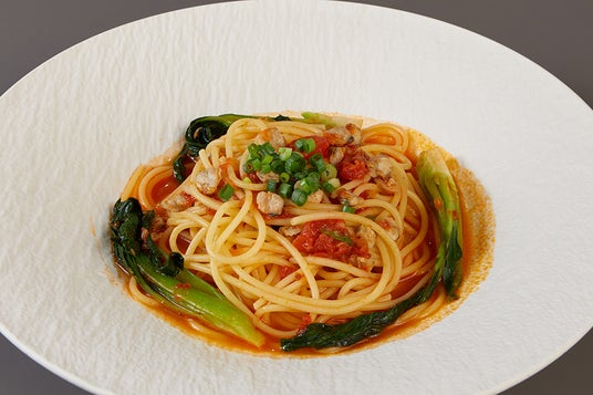 宍道湖ヤマトシジミと浜田産ミニ青梗菜を使ったトマト風味のスパゲッティ