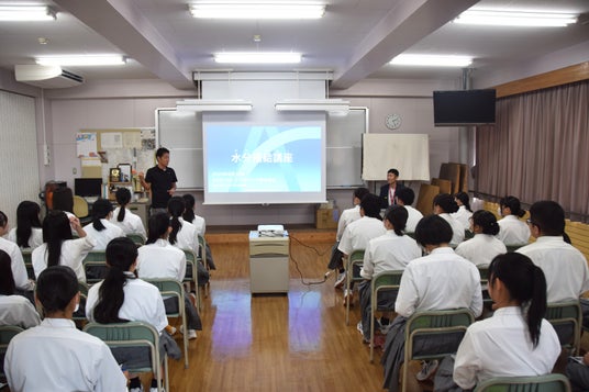 水分補給教室では、将来介護・看護のスペシャリストになるべく必要な知識・技術を学ぶ生徒に対し、水分補給の必要性やスポーツ飲料「アクエリアス」の特長などについて説明。