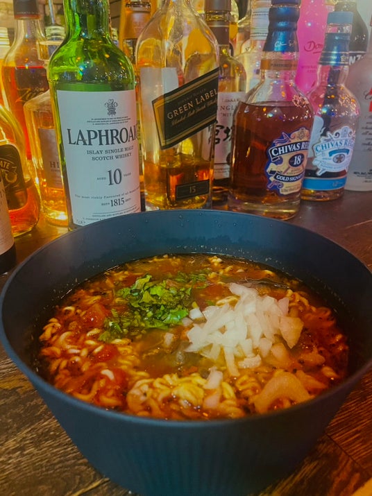 本場ではタコスをスープにディップしながらラーメンも食べます。