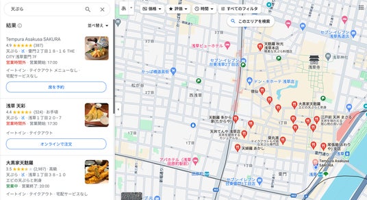 そこで今回、浅草と山手線内の全ての天ぷらカテゴリーのお店の評価をGoogleマップで調査しました。対象は「300件以上のレビューがあり、評価が4.5以上の店舗」に絞っています。