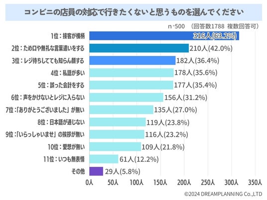 コンビニの店員の対応で行きたくないと思うものを選んでください 【n=500 回答数1788 複数回答可】