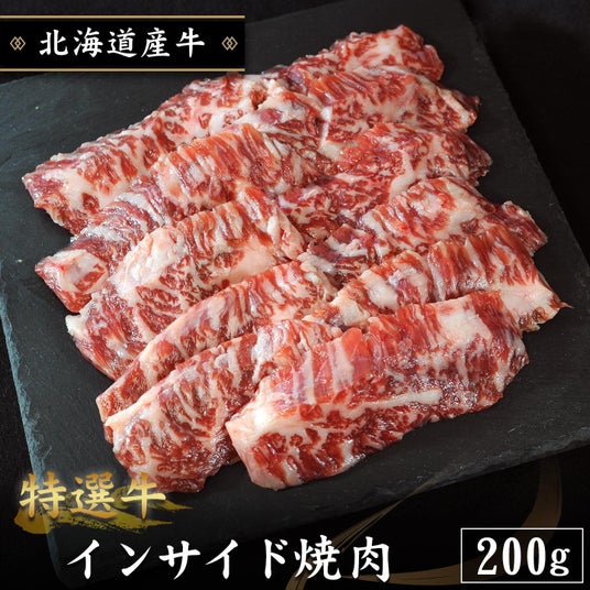 北海道産 特選牛インサイド焼肉ハラミに似た食感と、バラ肉の濃厚な旨みが楽しめる「インサイド」。赤身と脂身のバランスが絶妙で、噛むほどに肉の旨みが溢れ出します。