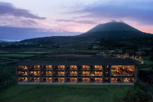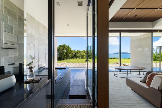 五島のシンボル「鬼岳」の噴火により形成されたとされる溶岩海岸を見下ろす高台に位置しています。内装設計とデザインを手がけた橋本夕紀夫氏がテーマに掲げたのは「The view」。どこまでも続く美しい海景、身体を包み込む海風。鐙瀬ならではのダイナミックで雄大な自然が主役となるようなデザインが、館内にちりばめられています。