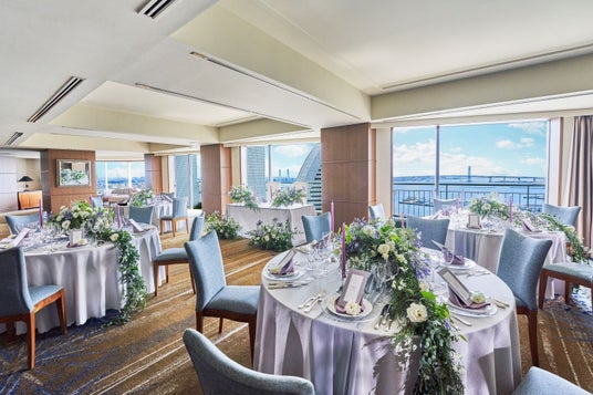 足下から天井まで開かれた大きなガラス窓から、横浜港を一望できる、最上階のバンケットルームです。(50名さままで)