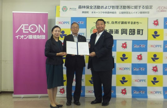 オホーツク海の潮風による農業への影響対策として、1959年に興部町有林に植樹された防風林を持続的に保全することを目的として、公益財団法人イオン環境財団、興部町、オホーツク中央森林組合の3者で協定が締結されました。2024年7月30日から2029年3月31日までの約5年間で、約3haの植樹を進めていくこととしています。