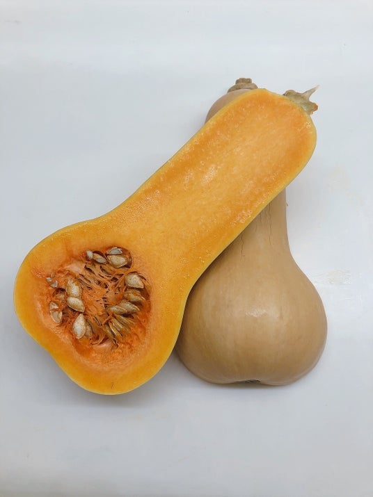 バターナッツかぼちゃは、ひょうたん型の白っぽい果皮が特徴のかぼちゃです。名前の由来となっているように、バターのような滑らかさとナッツのような風味があり、生のままでも加熱しても美味しく食べられます。
