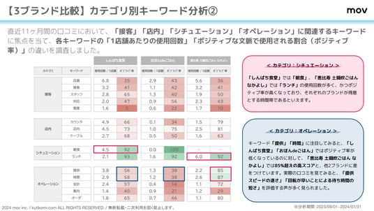 こちらの表では、「接客」「店内」「シチュエーション」「オペレーション」に関連するキーワードに焦点を当て、各キーワードの「1店舗あたりの使用回数」「ポジティブ率」の違いを調査しています。