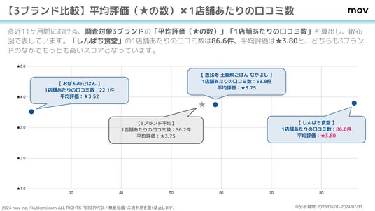 こちらの散布図では、調査対象3ブランドの「平均評価(★の数)」「1店舗あたりの口コミ数」を算出しています。「しんぱち食堂」の1店舗あたりの口コミ数は86.6件、平均評価は★3.80と、どちらも3ブランドのなかでもっとも高い(多い)スコアとなっています。