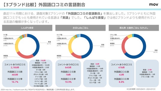 こちらのグラフでは、調査対象3ブランドの「外国語口コミの言語割合」を算出しました。3ブランドともに外国語口コミでもっとも使用されている言語は「英語」でした。「しんぱち食堂」では他2ブランドよりも使用されている言語の種類が多くなっています。