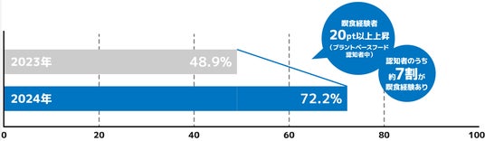 女性の20代、30代を中心に、プラントベースフード(植物性食品)経験者の数は着実に増えており、全体でも、前回調査(2023年)との比較において、20pt以上増えて、認知者のうち約7割(72.2%)は喫食を経験している。