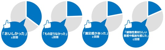 プラントベースフード(植物性食品)喫食経験者の喫食した感想は、「おいしかった」がトップとなっている。一方では「もの足りなかった」が2番目に高い。おいしさを追求しつつ、もの足りなさの解消が今後の課題となっている。