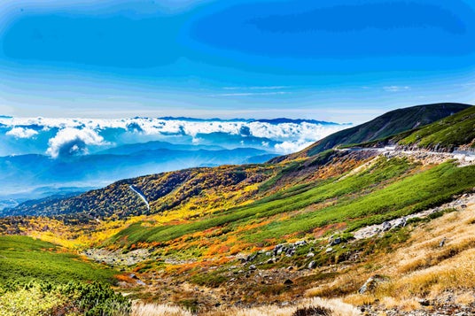 乗鞍岳(3,026m):9月下旬~10月上旬の紅葉はみごとで、ハイマツの緑、ダケカンバの黄色にナナカマドの赤が映えます