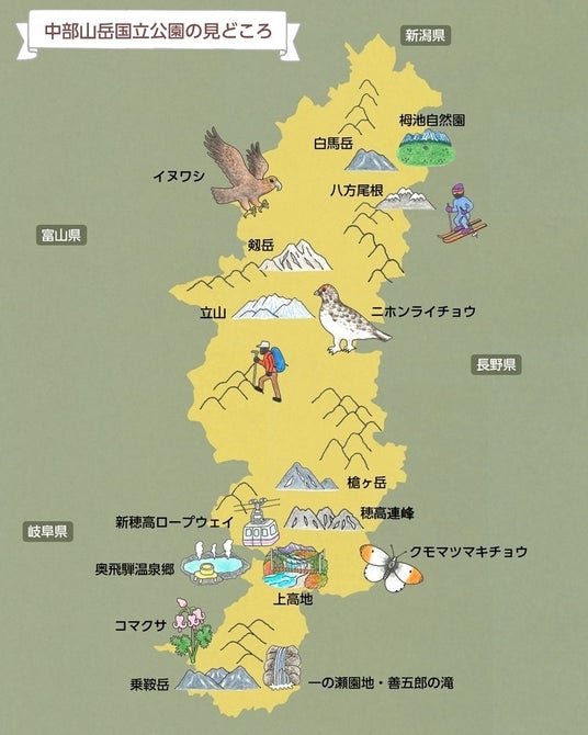 出典:地理院地図を加工して作成 中部山岳国立公園の見どころ https://www.env.go.jp/park/chubu/guide/view.html 環境省 中部信越自然環境事務所 HPより抜粋・引用