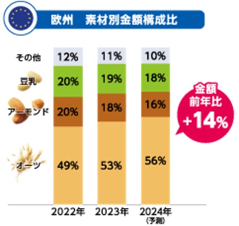 市場拡大が期待されるオーツミルク市場、すでに欧州では一般的で今後も伸長傾向近年、人気カフェチェーンでミルクのオプションとしてオーツミルクが定番化するとともに、飲食店のドリンクメニューにもオーツミルクが普及しています。日本でのオーツミルク市場は対前年比約2倍※2と継続的に成長しており、今後も市場拡大が期待されています。また、植物性ミルクのうち日本では豆乳が主流ですが、欧州ではオーツミルクが一般的で、一番伸長している(右図)という現状もあります。