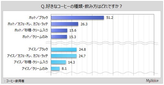ホットでは、「ブラック」が51.2%、「カフェ・オレ、カフェ・ラッテ」が26.3%、「砂糖・クリーム入り」「クリームのみ」が15~16%です。