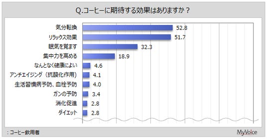 ■コーヒー飲用者が期待する効果は「気分転換」「リラックス効果」が各5割強、「眠気を覚ます」が3割強、「集中力を高める」が2割弱