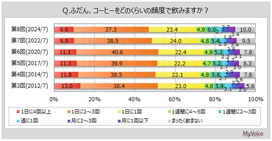 マイボイスコム株式会社(東京都千代田区、代表取締役社長:高井和久)は、8回目となる『日常生活とコーヒー』に関するインターネット調査を2024年7月1日~7日に実施しました。