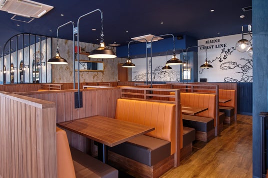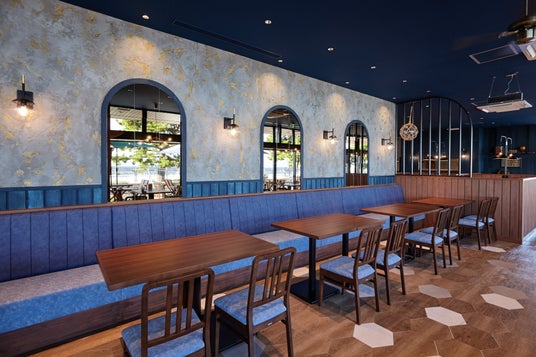 ネイビーを基調とし海辺のリゾートのような雰囲気の店内
