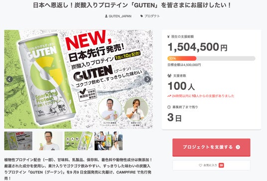 株式会社グーテン ジャパンでは、9月に発売を控えているプロテイン入り炭酸飲料「GUTEN」のクラウドファンディングを行っています。そんなクラウドファンディングですが、多くの反響をいただき、支援数が100人を越えました。皆様の暖かいご支援、誠にありがとうございます。