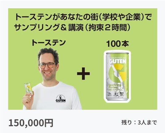 「GUTEN」を世に生み出したのは、株式会社グーテン ジャパンの代表でもあるドイツ人のトーステンです。トーステンは高校留学をきっかけに日本に魅了され、日本の大学に留学したり、日本で会社を設立するなど、日本との深い繋がりを持っています。日本で多くの人にお世話になっているため、今回のドリンクで日本の人々に健康になってほしいと願っているのです。そんな特別なリターンがこちらです。ご要望のある場所に訪れて講演などを行います