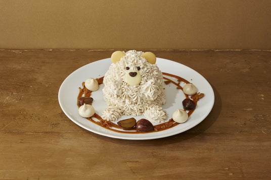 当店自慢のスフレパンケーキを土台に”和栗”と“ほうじ茶”をペアリングしてテディベアの形にアレンジ。