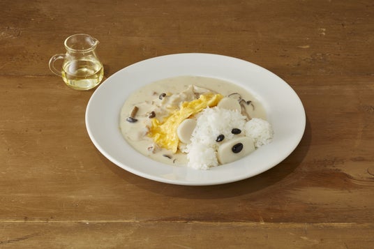白米をテディベアの顔に見立てた、ホワイトソースとトリュフ香る可愛らしいデザインが特長的なオムライスです。