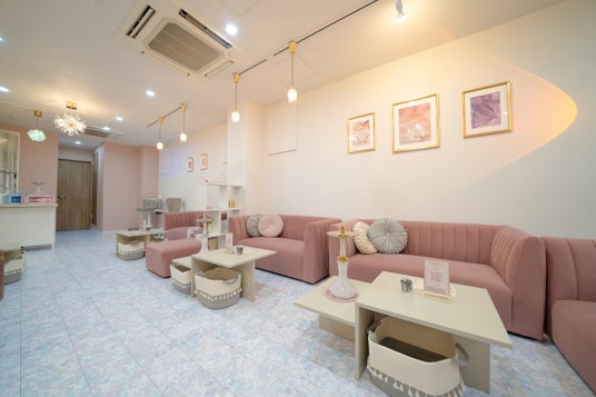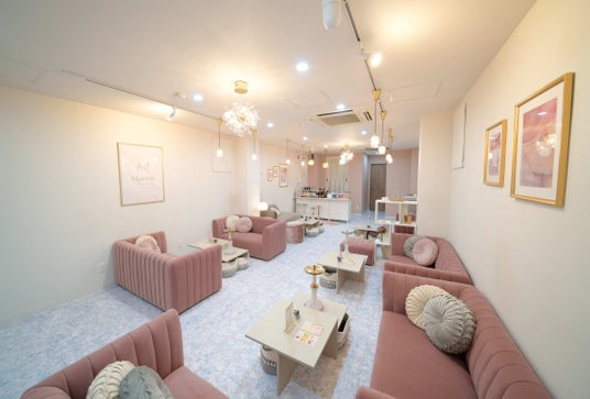 配色はピンク、白、グレーをメインとし、満席時でもゆったりとくつろげるソファの配置となっております。印象的なフロアタイルのデザインや照明が、当店の世界観を演出しております。