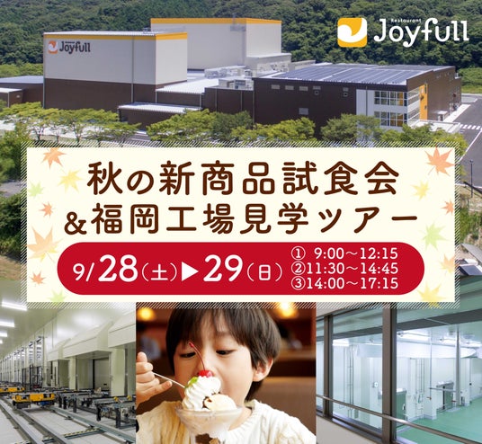 ファミリーレストランチェーン「ジョイフル」を展開する株式会社ジョイフル(本社:大分県大分市三川新町一丁目1-45代表取締役社長:穴見くるみ)は、2024年9月28日(土)・29日(日)に「秋の新商品試食会&福岡工場見学ツアー」を2日間限定で開催いたします。