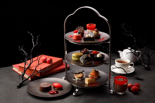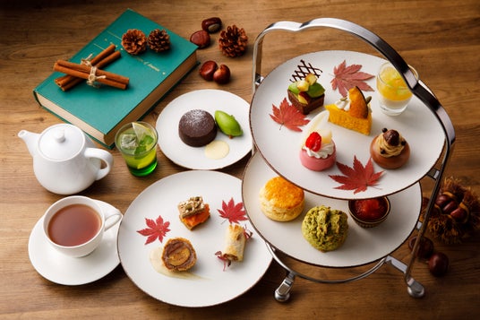 赤と黒がテーマのアフタヌーンティー。秋を象徴する食材と無農薬栽培の玉露を使ったスイーツやセイボリーをお楽しみください。