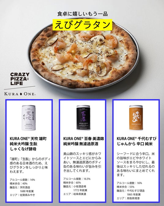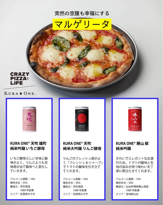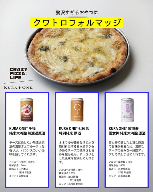 CRAZY PIZZA : LIFEの8種類のピザとKURA ONE(R)の21銘柄の日本酒をペアリングし、その中から4種類のピザに最も合う日本酒銘柄を厳選しました。
