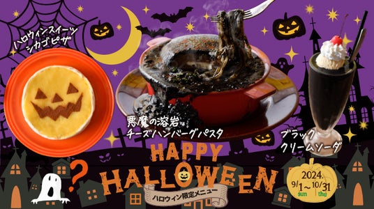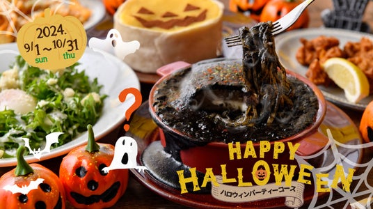 2024年9月1日(日)~10月31日(木)の期間限定で、キュートなおばけがハロウィン気分を盛り上げる『ハロウィンパーティーコース』が新登場!”真っ黒”な見た目に衝撃が走る「悪魔の溶岩チーズハンバーグパスタ」やいたずら好きなオバケが笑う「ハロウィンスイーツシカゴピザ」などハロウィン仕立ての全5品に、豪華飲み放題も付いた特別プランとなっております!