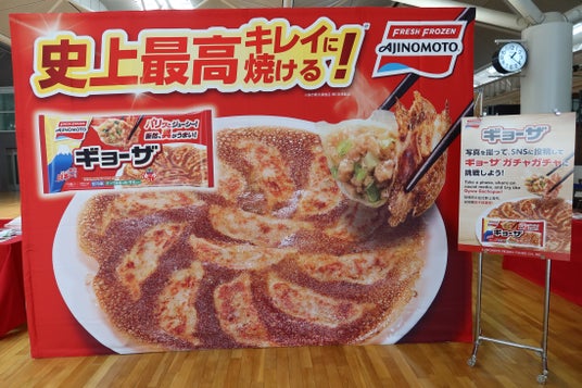 味の素冷凍食品株式会社の冷凍ギョーザが全面に描かれたインパクトのあるボードを会場に設置。