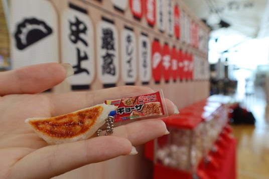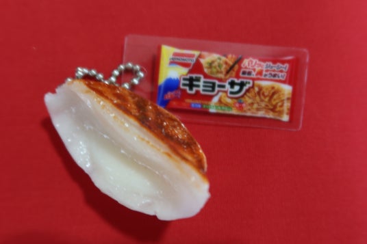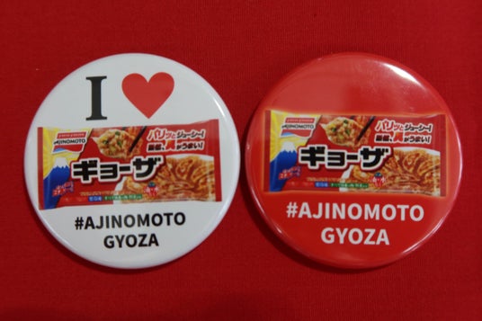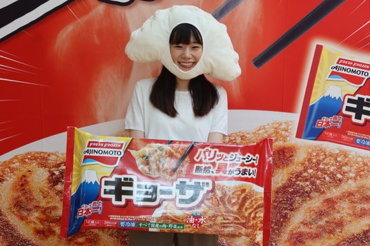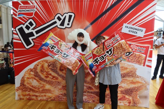 迫力あるボードを背景に、巨大な味の素冷凍食品のギョーザパッケージやギョーザをかぶって記念写真。