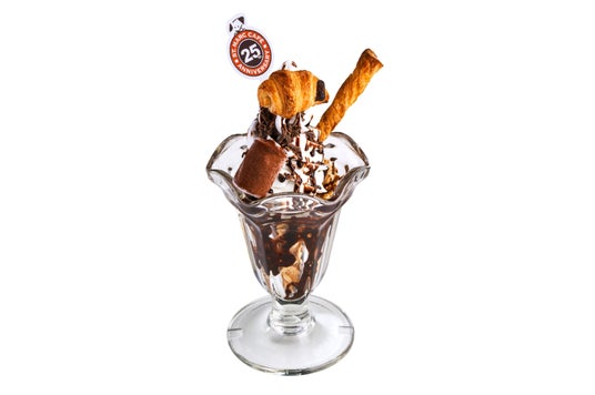 「チョコクロづくし チョコクロパフェ」は、見た目、味わい、食感全てでチョコクロを存分に感じていただけるデザートです。チョコクロの中の濃厚なチョコレートの味わいを表現する生チョコアイスやチョコレートソースと、チョコクロの食感や香ばしさを表現する、サクサクの自家製デニッシュスティックを北海道産生乳100%のソフトクリームにトッピング。自家製デニッシュスティックは、チョコクロの生地を使用しお店で丁寧に焼き上げており、チョコクロのサクサク食感を存分にお楽しみいただけます。トップには、「ミニミニチョコクロ」に加え、サンマルクカフェオリジナルキャラクターの犬の「チョコクロ」をモチーフにした25周年記念ロゴのピックがあしらわれており、まさにチョコクロづくしのデザートメニューとなりました。