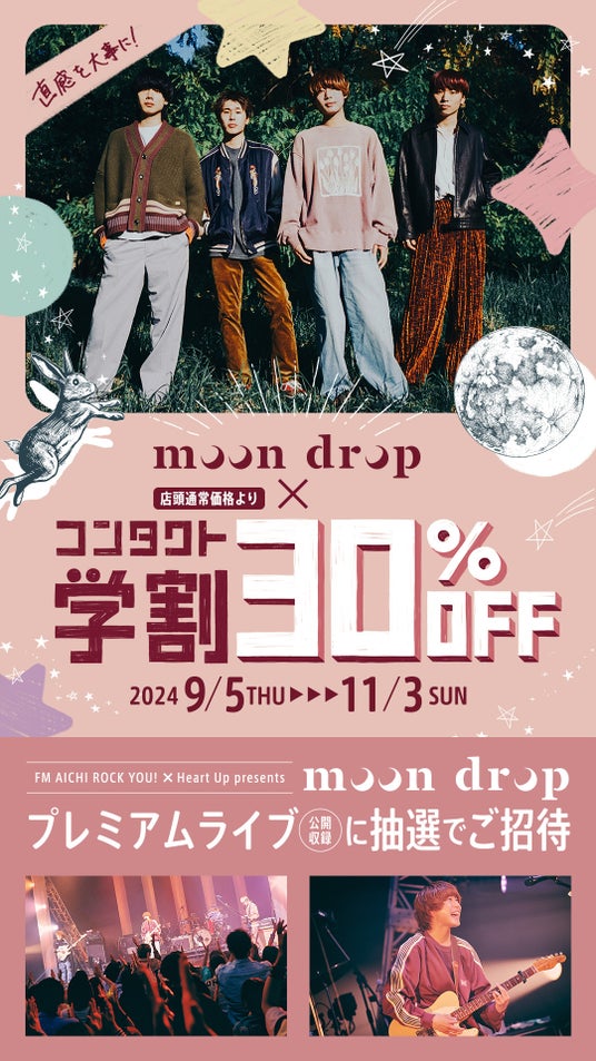 株式会社日本オプティカル(代表取締役社長 前田貴志)は、“愛だの恋だのラブソングだけを歌い続けるバンド”「moon drop」とコラボレーションした【ハートアップ×FM AICHI ROCK YOU! Presents】「コンタクト学割×moon drop」を2024年9月5日(木)~11月3日(日)の期間、開催致します。